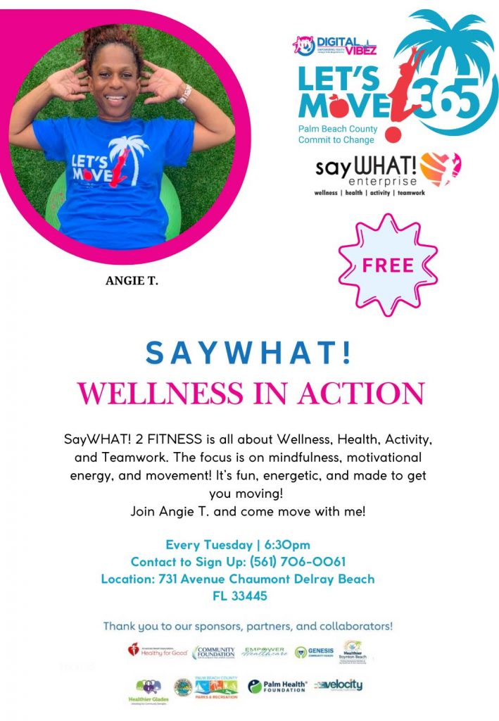 SayWHAT! 2 FITNESS is all about Wellness, Health, Activity, and Teamwork. The focus is on mindfulness, motivational energy, and movement! It’s fun, energetic, and made to get you moving! Join… Continue reading SayWHAT! Wellness in action with Angie T.