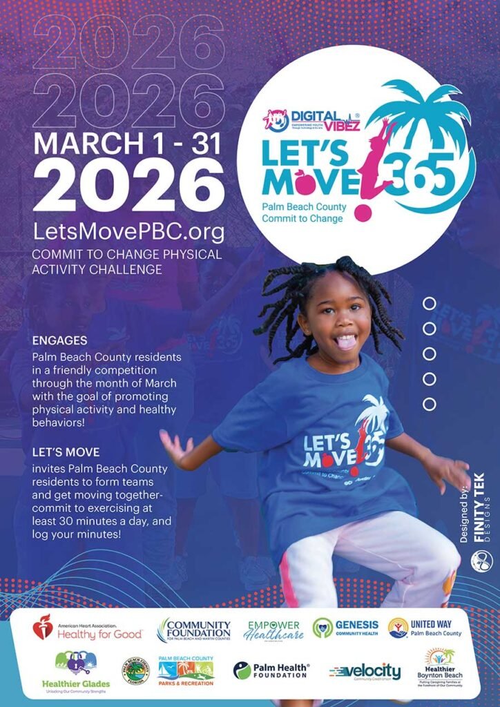 The Let’s Move: Commit to Change Physical Activity Challenge is a county-wide initiative that encourages Palm Beach County residents to get active and live healthier. Presented annually by Digital Vibez, Inc. and Palm Health Foundation, the challenge takes place March 1–31 and inspires individuals, families, schools, and organizations to move more and feel better together.